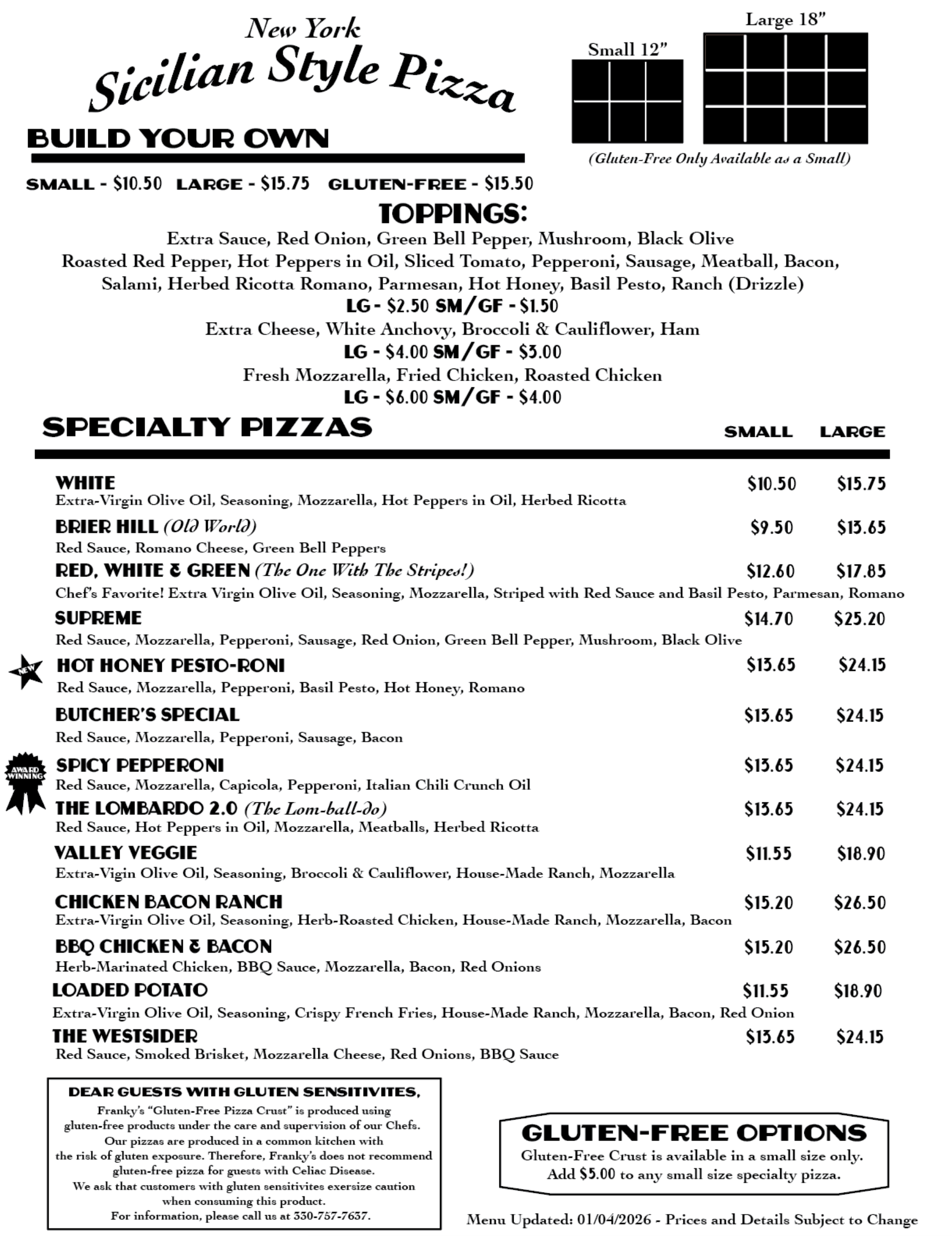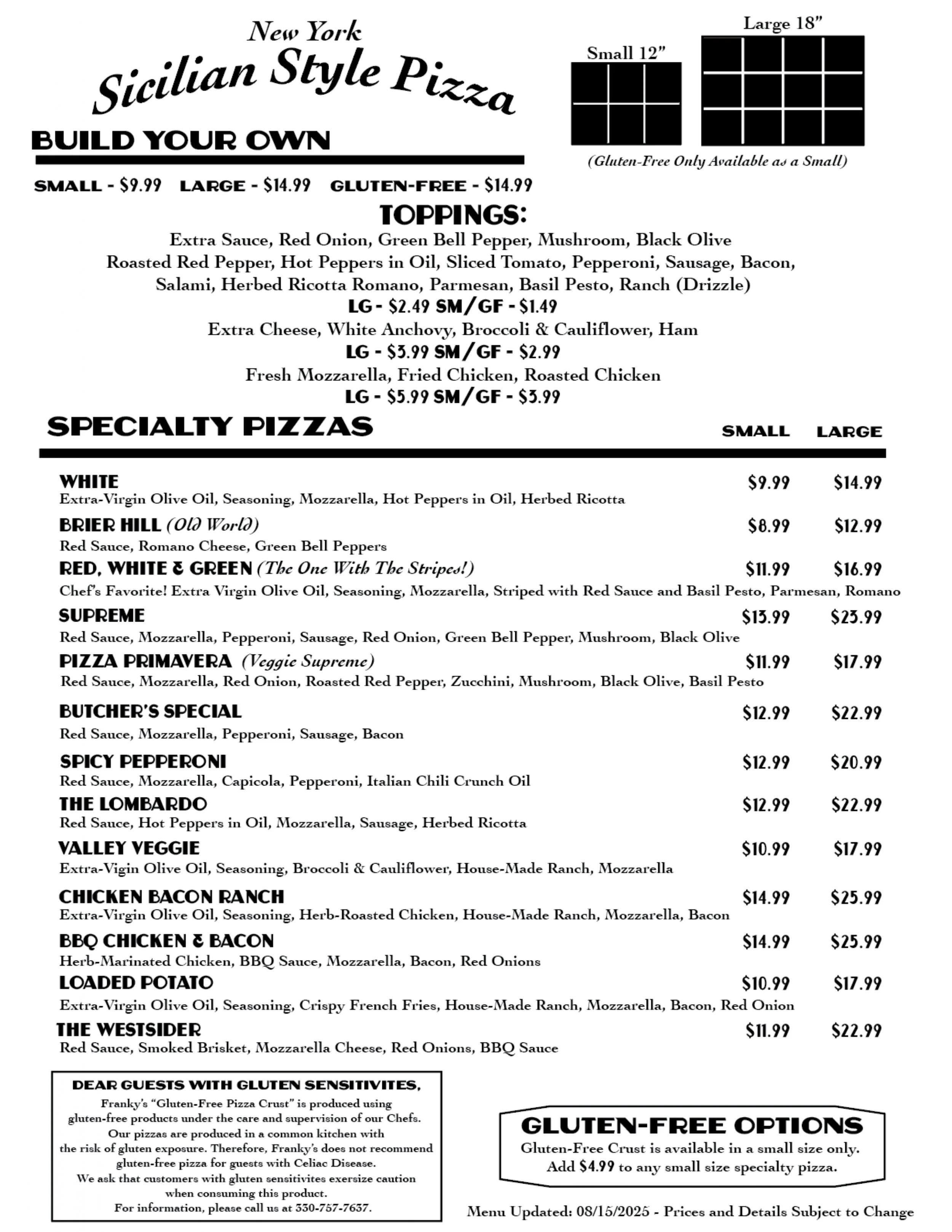 When the crew’s hungry and the party’s calling, Franky’s brings the heart of Warren straight to your table. Big pies, bold trays, and sandwiches built like muscle cars — we’re here to feed your whole crowd.
